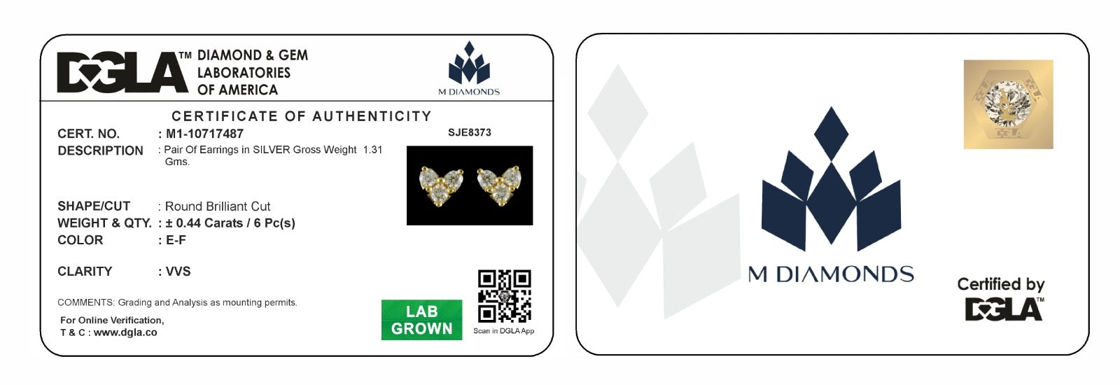 The diamond certification process for both natural and lab-grown diamonds is similar. Expert gemologists evaluate the diamond’s 4C’s - cut, carat, colour and clarity- using advanced technology. At MDIAMONDS, we get our diamonds certified from a reputable lab DGLA (Diamond & Gem Laboratories of America). This certification guarantees transparency and trust offering you complete confidence in its value and authenticity.